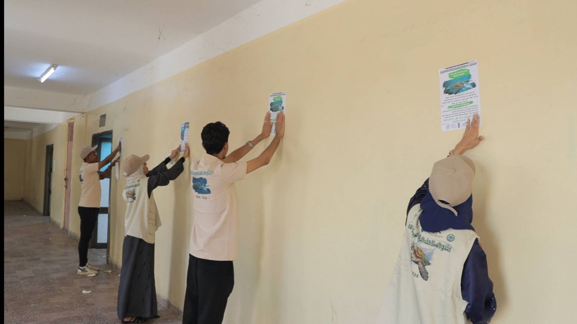 Supervised by the Ruaa Centre team, the campaign aims to enhance environmental awareness among media students and engage them in spreading project messages within the campus and surrounding areas. The posters feature guidelines on sea turtle protection, ways to reduce harmful practices that threaten nesting sites in the Gulf of Aden, and legal information relevant to their protection.