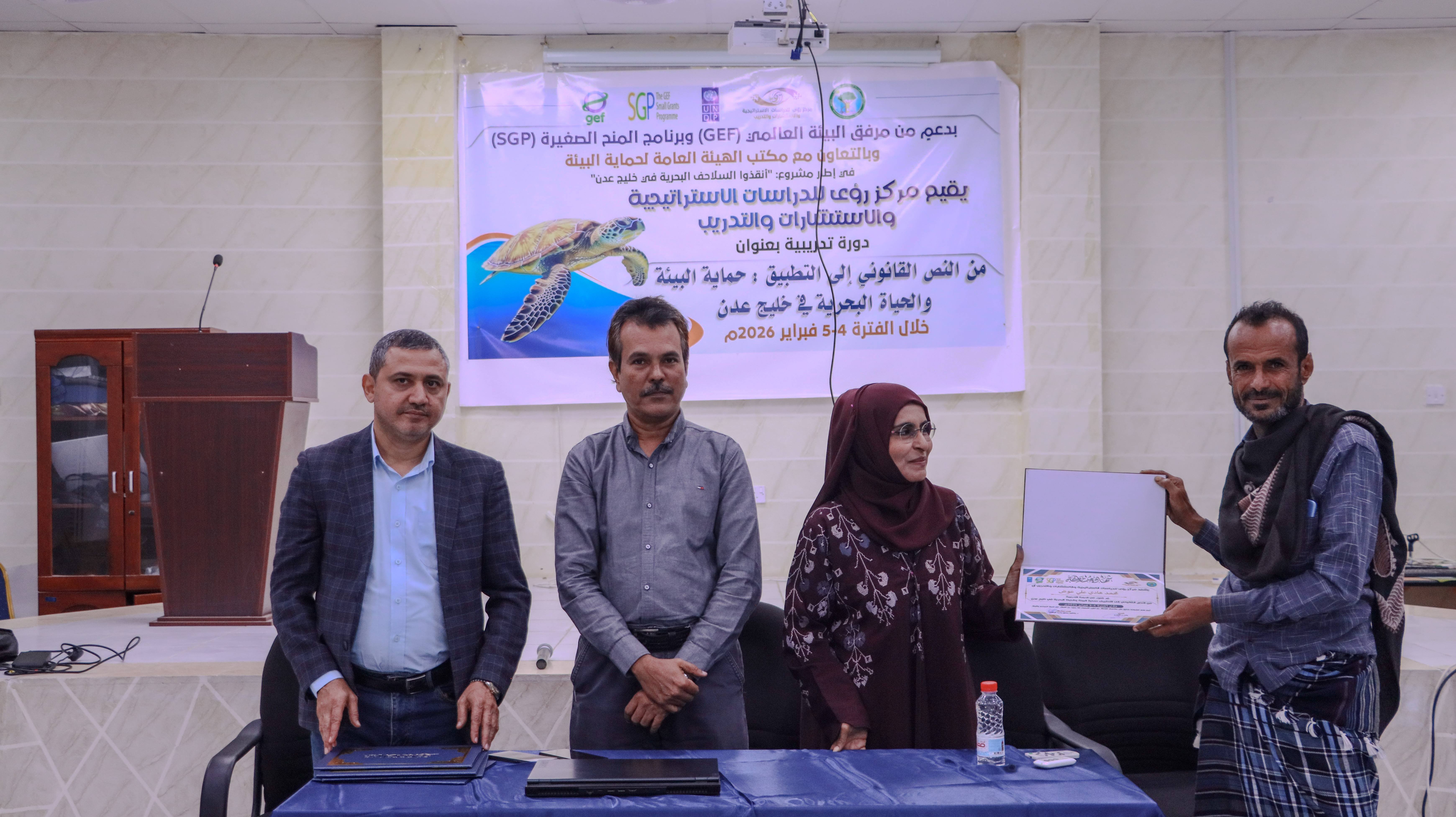 اختتم مركز رؤى للدراسات الاستراتيجية والاستشارات والتدريب، اليوم الخميس، وبالتعاون مع مكتب الهيئة العامة لحماية البيئة في عدن، الدورة التدريبية المعنونة: «من النص القانوني إلى التطبيق: حماية البيئة والحياة البحرية في خليج عدن»، والتي نُفذت ضمن مشروع «أنقذوا السلاحف البحرية في خليج عدن»، بدعم من مرفق البيئة العالمي (GEF) وبرنامج المنح الصغيرة (SGP).