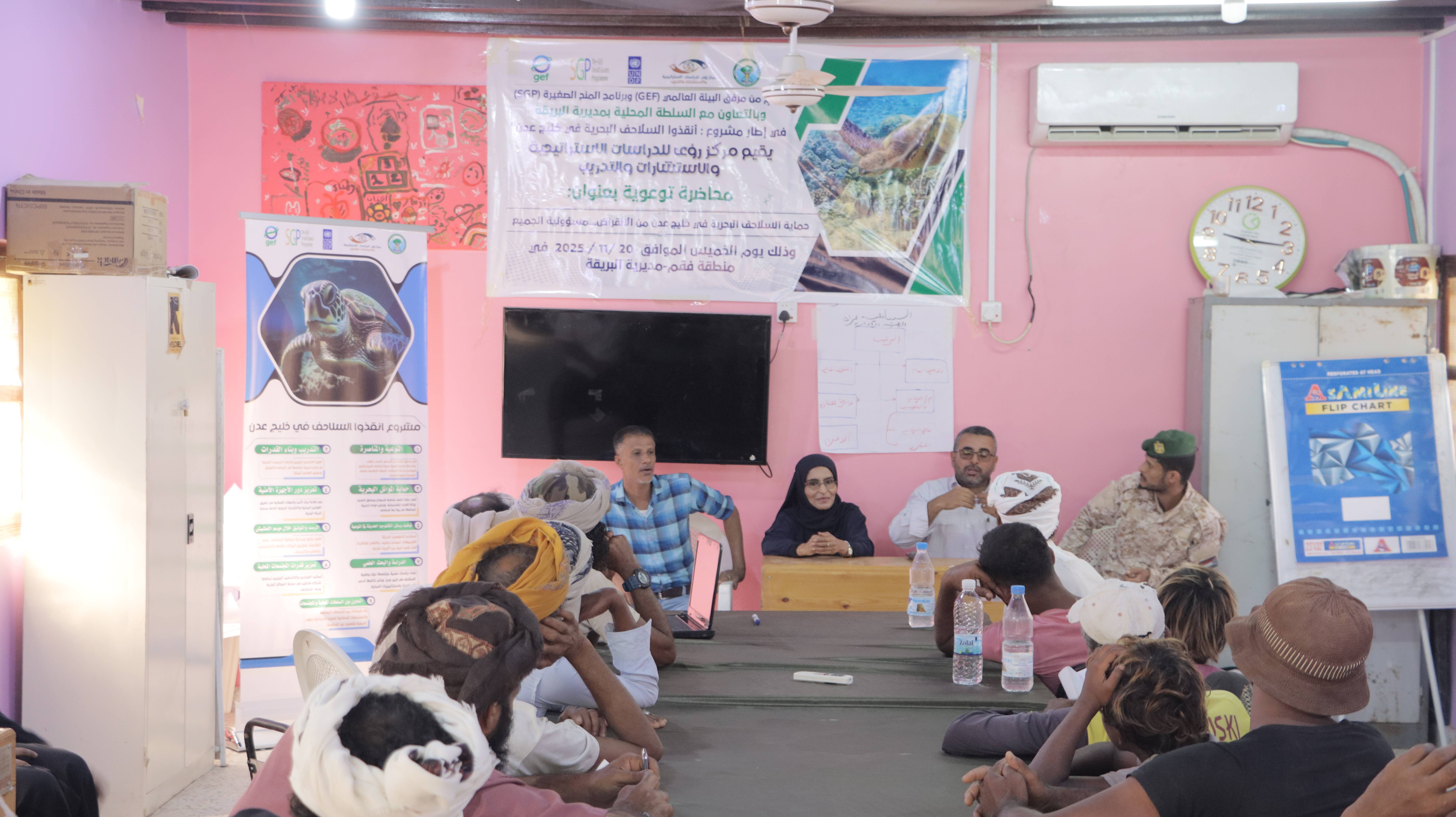 The lecture, conducted as part of the “Save the Marine Turtles in the Gulf of Aden” project, brought together a number of local fishermen with the aim of raising community awareness about their vital role in conserving marine turtles and reducing the risks threatening their survival.