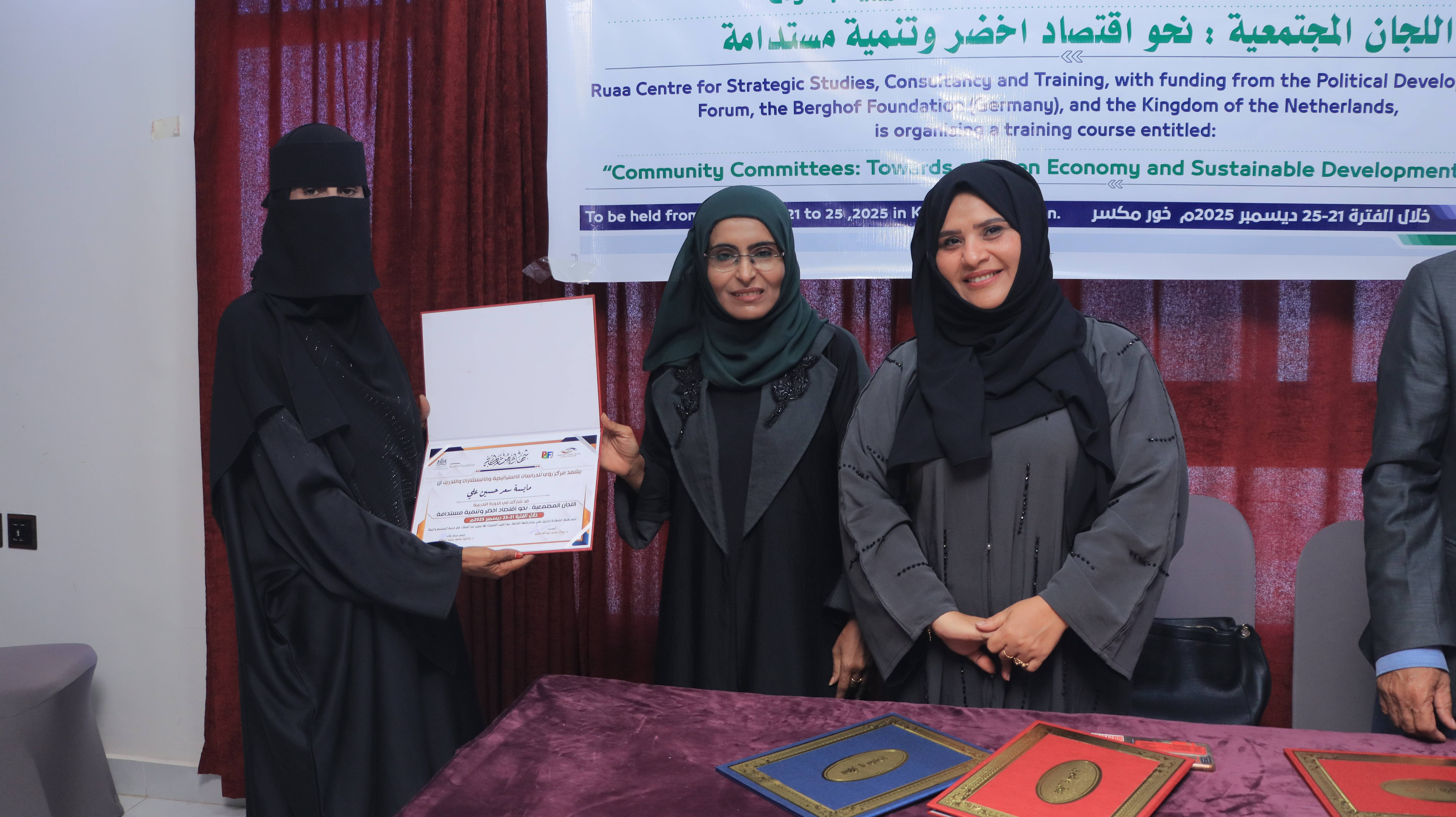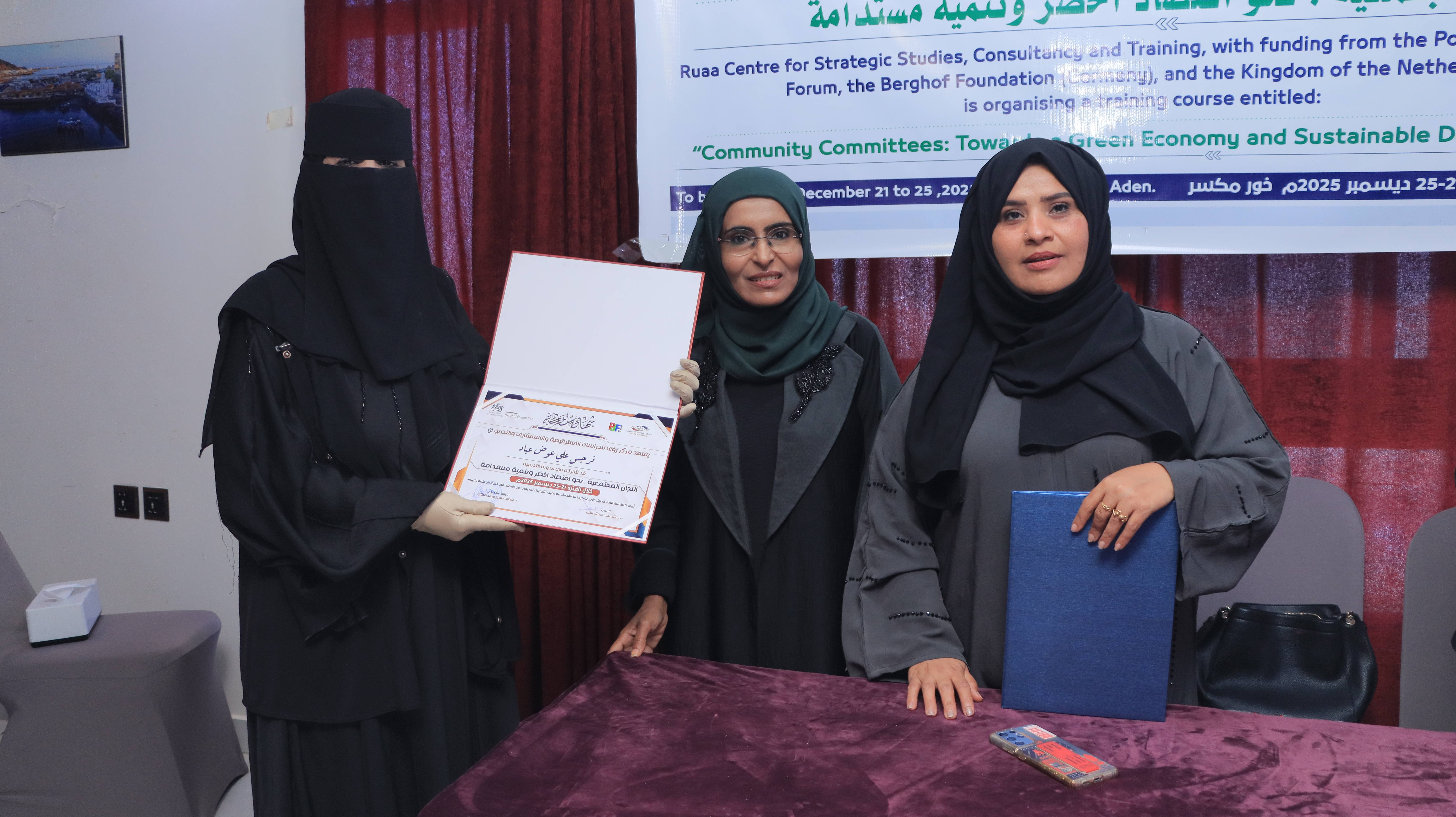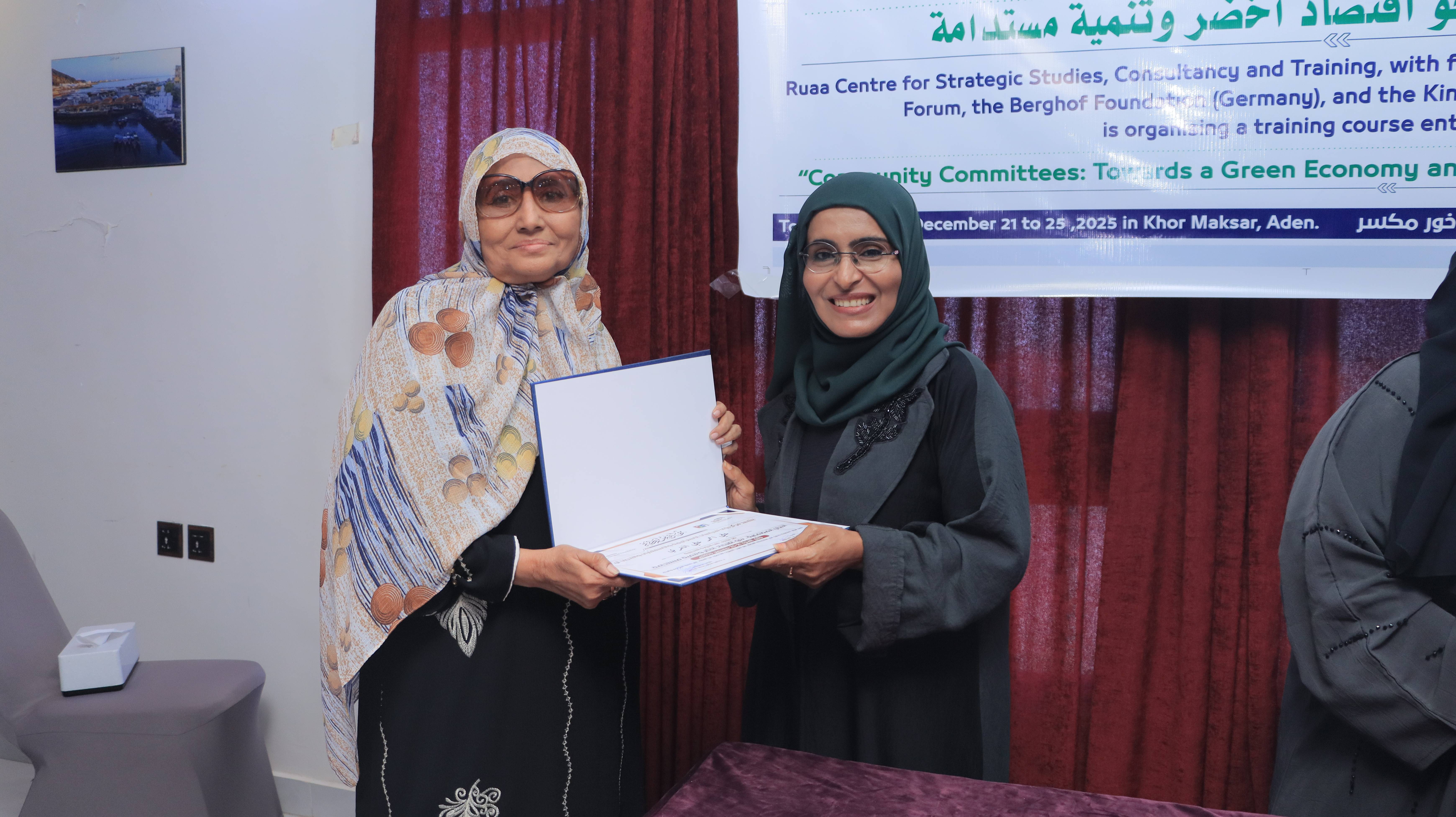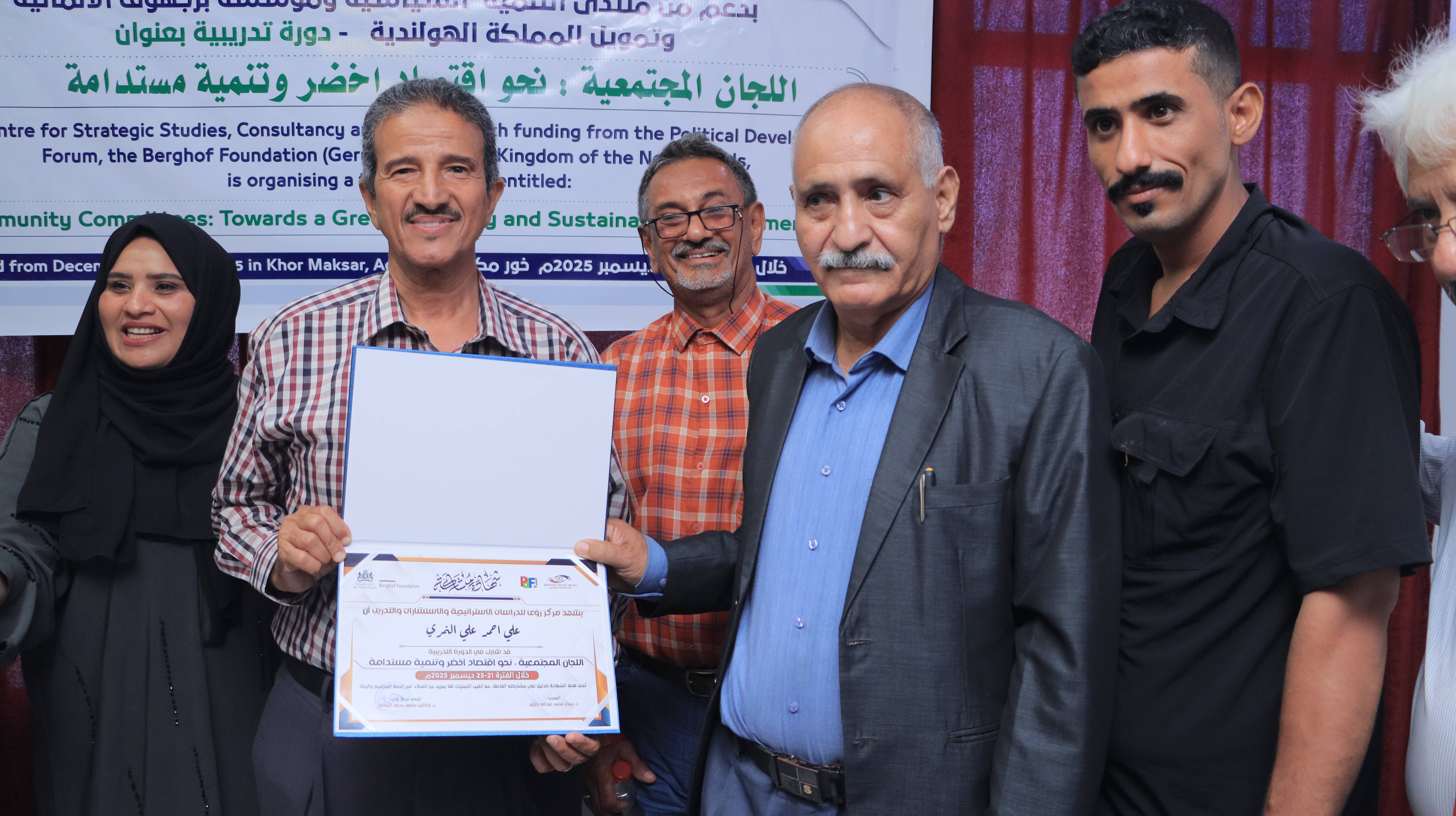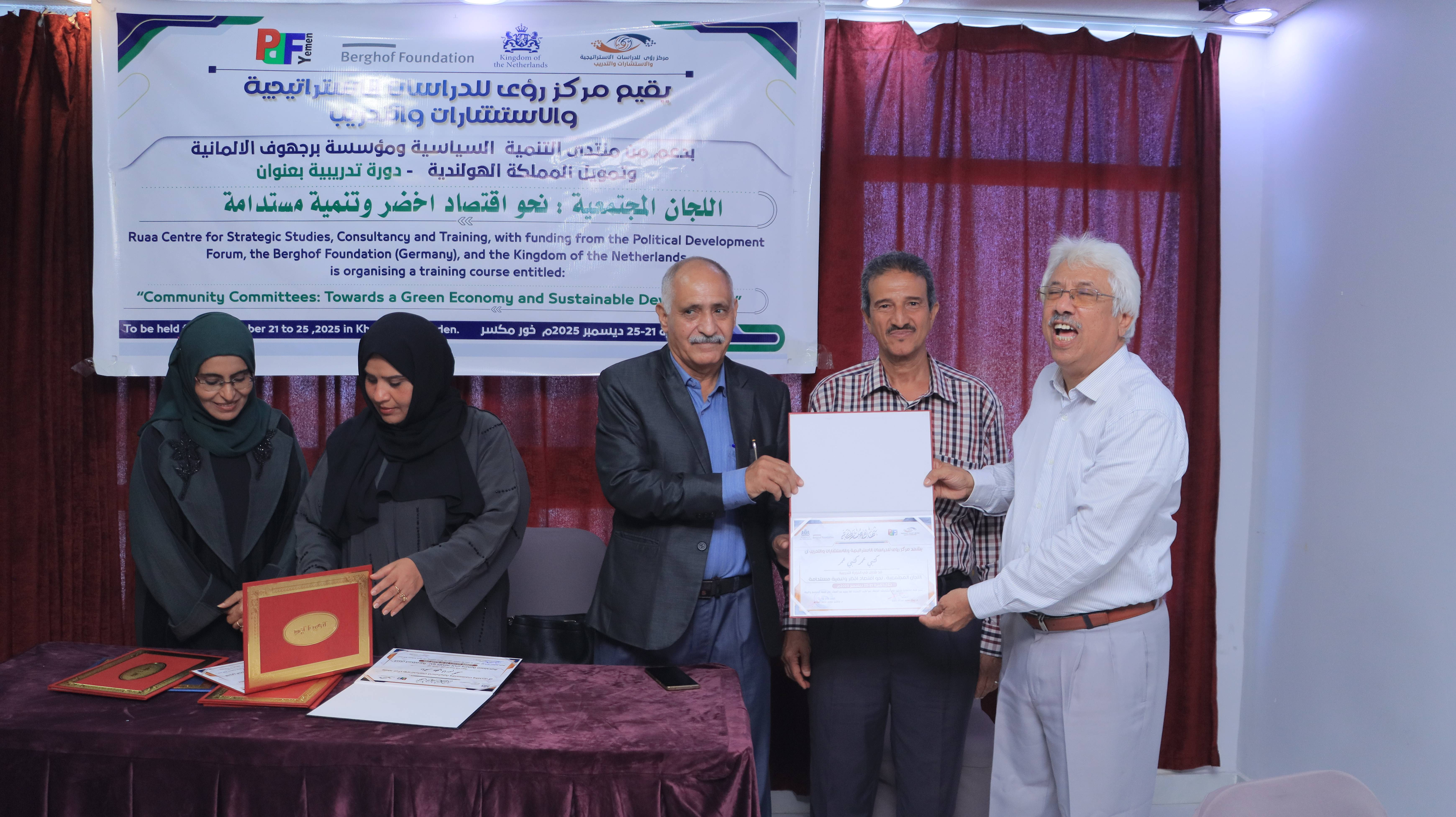 Today, Thursday, in the capital Aden, Ruaa Centre for Strategic Studies, Consultations, and Training concluded the training course titled “Community Committees: Towards a Green Economy and Sustainable Development.” The course was organized with the support of the Political Development Forum and the German Berghof Foundation, and funded by the Kingdom of the Netherlands, with the participation of a number of community committee leaders from the districts of the capital Aden.