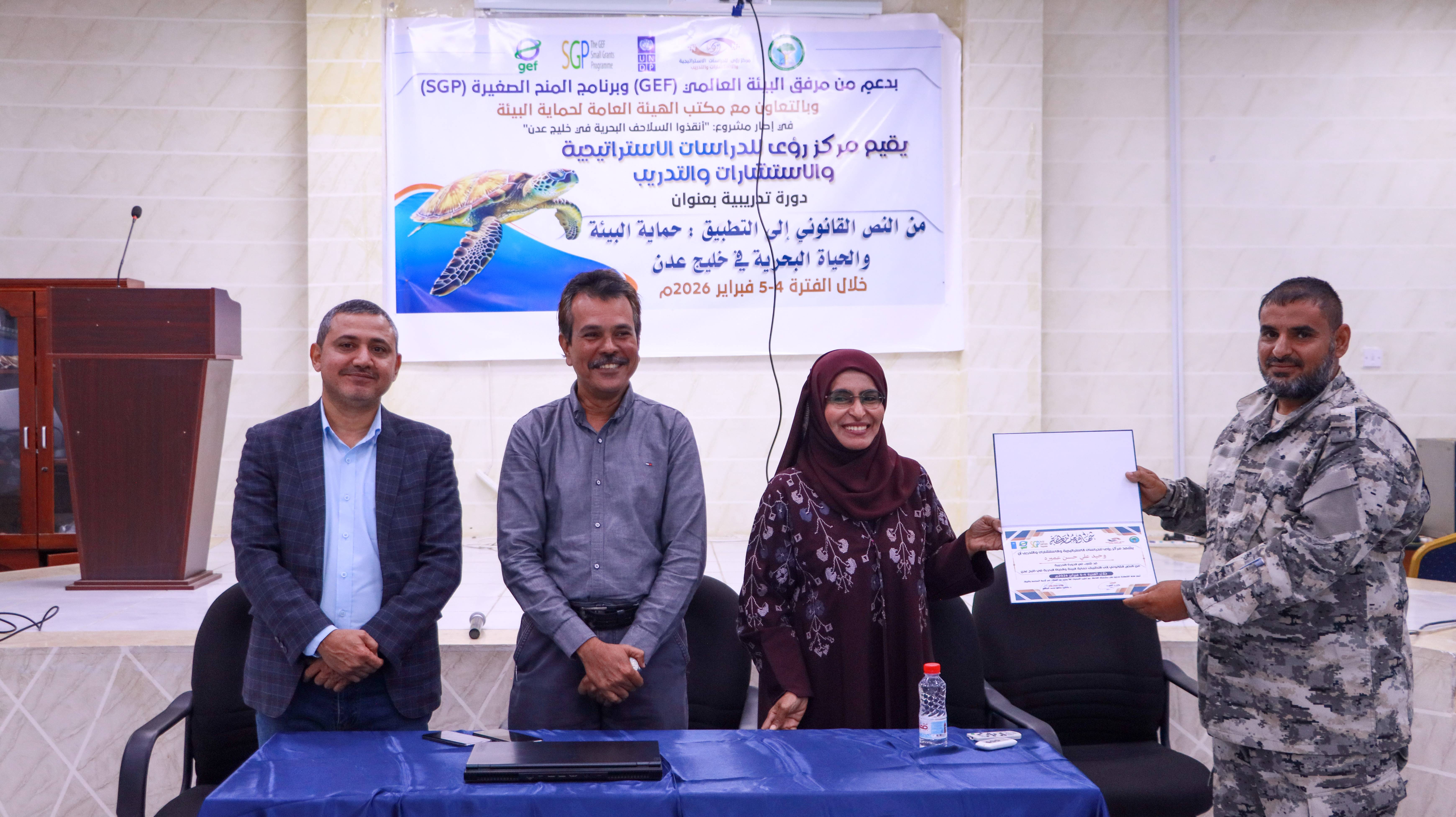 اختتم مركز رؤى للدراسات الاستراتيجية والاستشارات والتدريب، اليوم الخميس، وبالتعاون مع مكتب الهيئة العامة لحماية البيئة في عدن، الدورة التدريبية المعنونة: «من النص القانوني إلى التطبيق: حماية البيئة والحياة البحرية في خليج عدن»، والتي نُفذت ضمن مشروع «أنقذوا السلاحف البحرية في خليج عدن»، بدعم من مرفق البيئة العالمي (GEF) وبرنامج المنح الصغيرة (SGP).