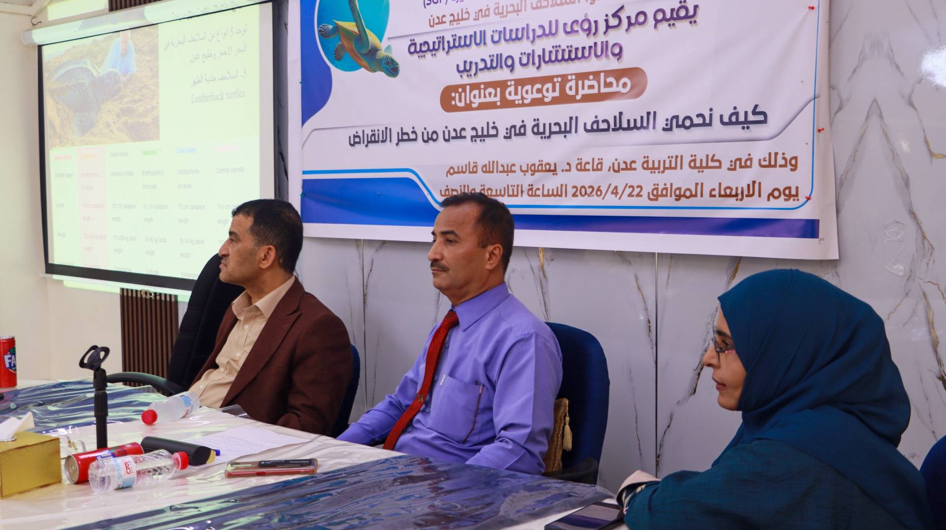 نظم مركز رؤى للدراسات الاستراتيجية والاستشارات والتدريب محاضرة توعوية بكلية التربية في جامعة عدن بعنوان: "كيف نحمي السلاحف البحرية في خليج عدن من خطر الانقراض"، وذلك ضمن مشروع "أنقذوا السلاحف البحرية في خليج عدن"، وبتمويل من مرفق البيئة العالمي (GEF) وبرنامج المنح الصغيرة (SGP)، بهدف تعزيز الوعي البيئي والحفاظ على التنوع الحيوي.